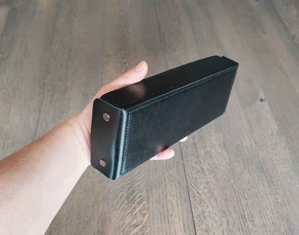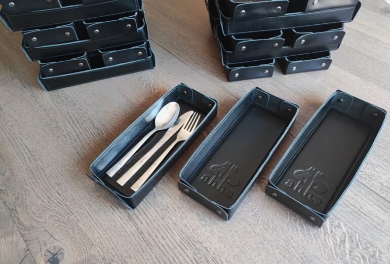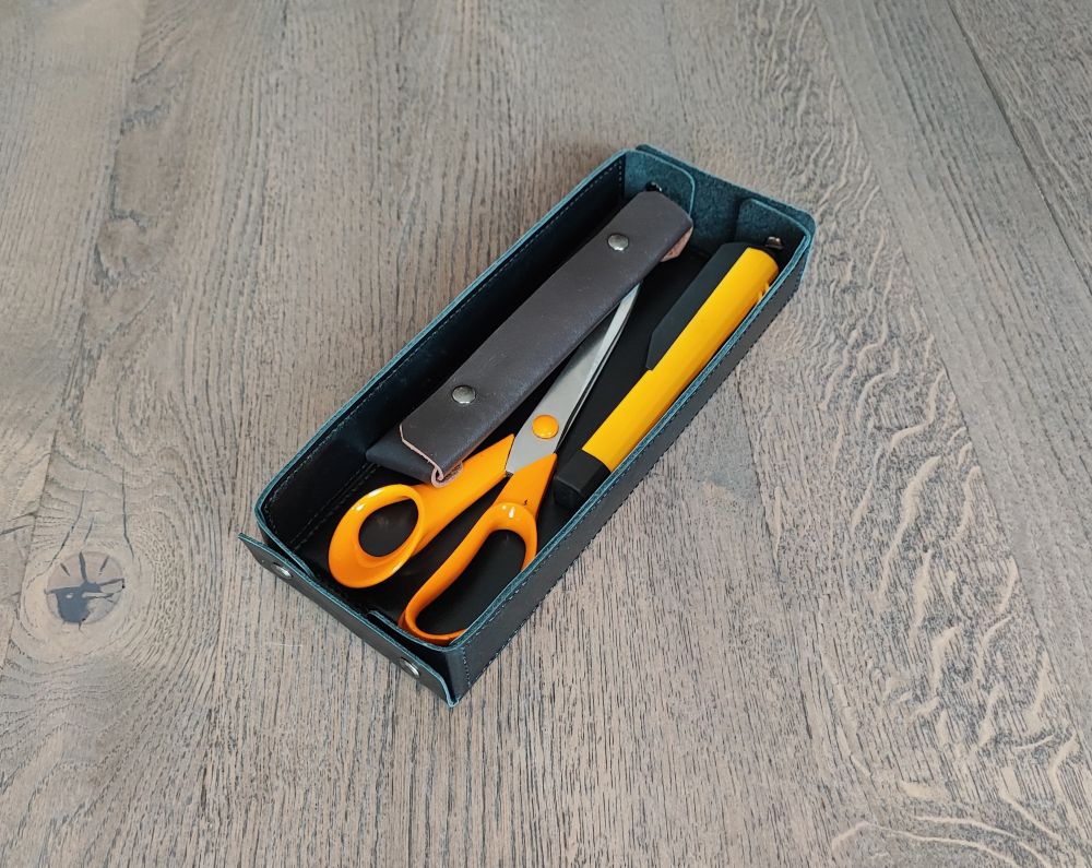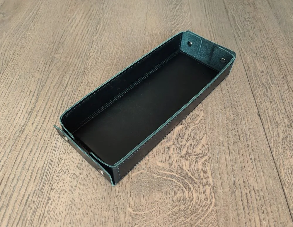 Aprašymas: Natūralios odos stalo įrankių dėkliukai / dėžutės / dėtuvės / sąskaitinės / čekių dėkliukai. Dėtuvės standžios, atviro tipo. Pastandinto korpuso ir apsiuvimais odinės dėžutės yra tvirtos, standžios ir neturi įlinkio kilnojant net ir su užpildytu turiniu. Logo įspaudimas ant dugnelio viduje.